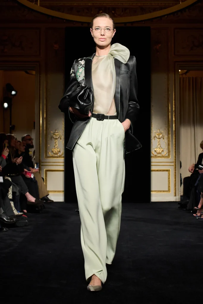 A coleção de alta-costura apostou em alfaiataria fluida, cores suaves e peças funcionais como pantalonas com corsets.