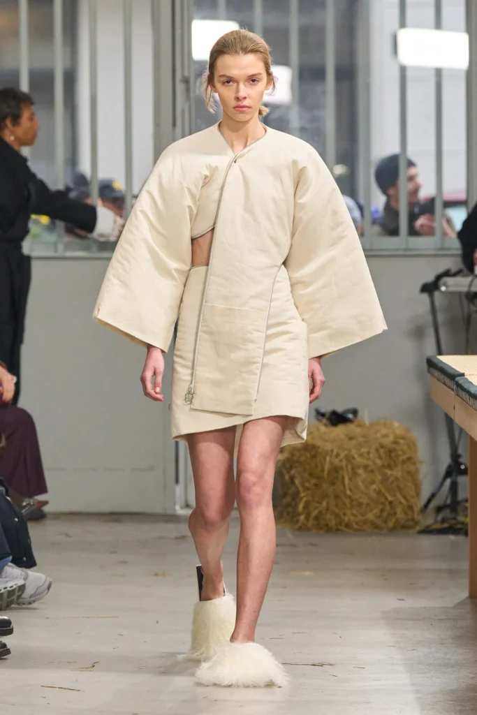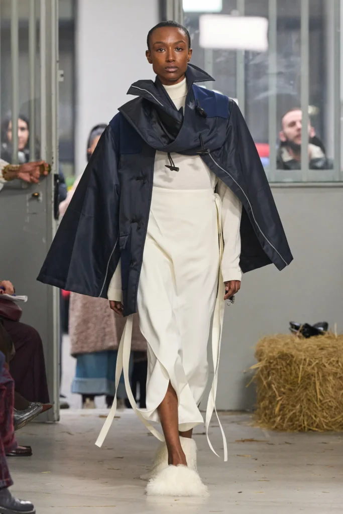 Na passarela, a inspiração se traduziu em casacos de pele, sapatos de palha, capas de chuva e uma alfaiataria contemporânea e desconstruída, com costuras inacabadas, tecido de papel, sobreposições e mangas invertidas em casacos estruturados.